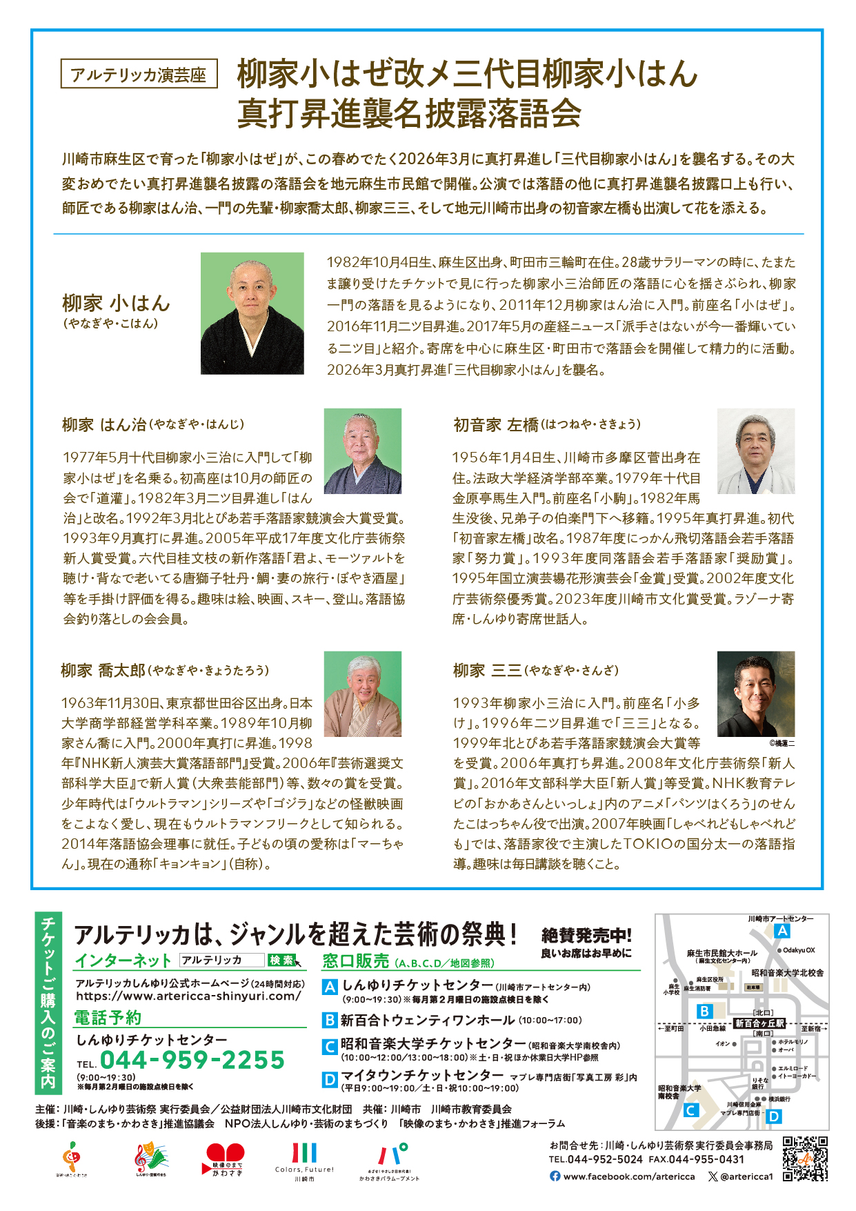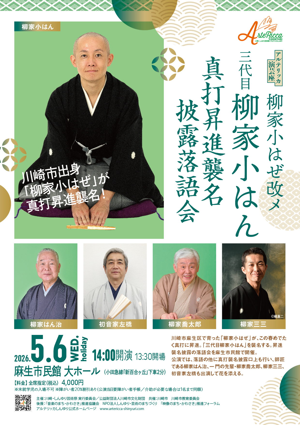 川崎市麻生区で育った「柳家小はぜ」が、この春めでたく2026年3月に真打昇進し「三代目柳家小はん」を襲名する。その大変おめでたい真打昇進襲名披露の落語会を地元麻生市民館で開催。公演では落語の他に真打昇進襲名披露口上も行い、師匠である柳家はん治、一門の先輩・柳家喬太郎、柳家三三、そして地元川崎市出身の初音家橋も出演して花を添える。