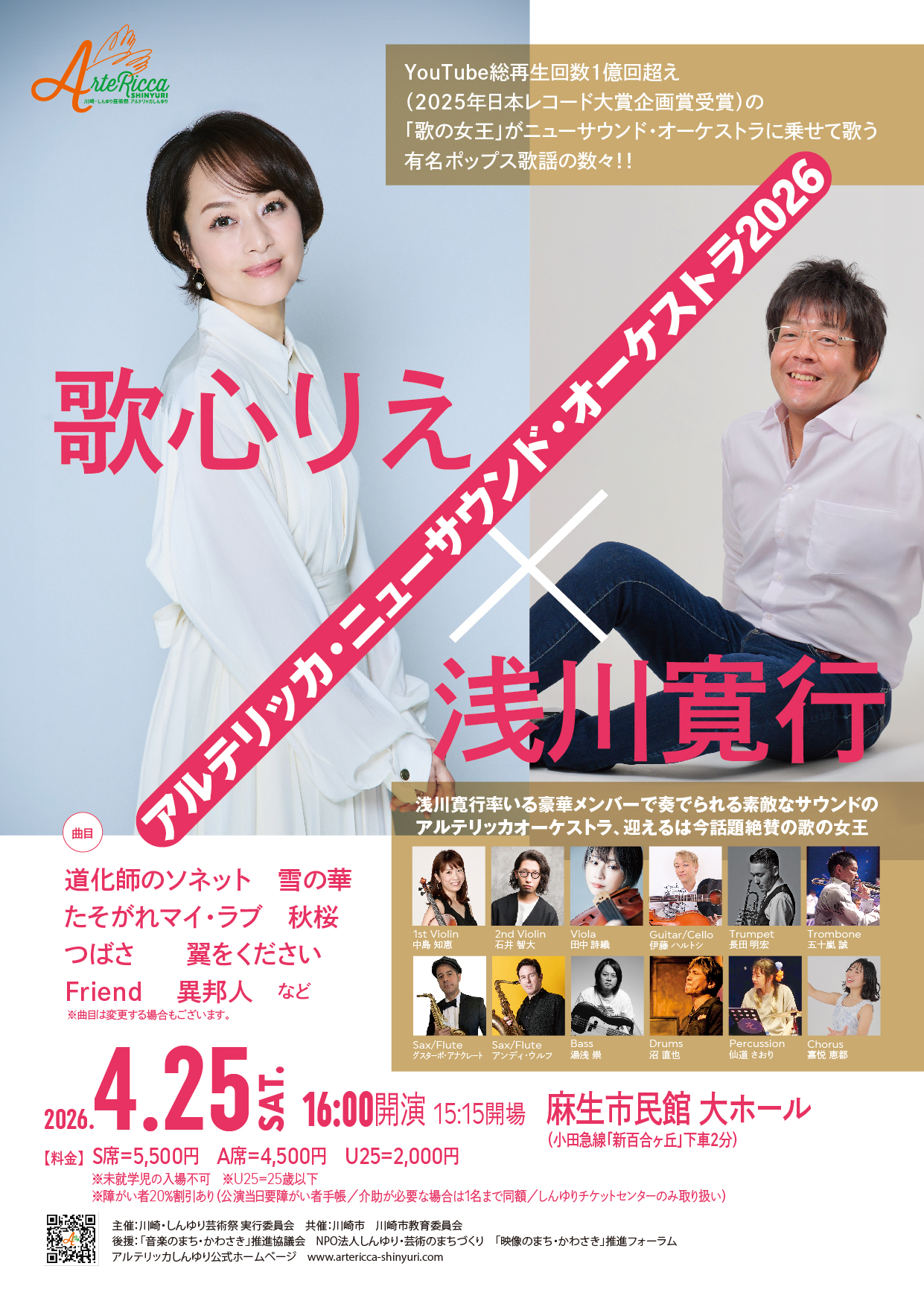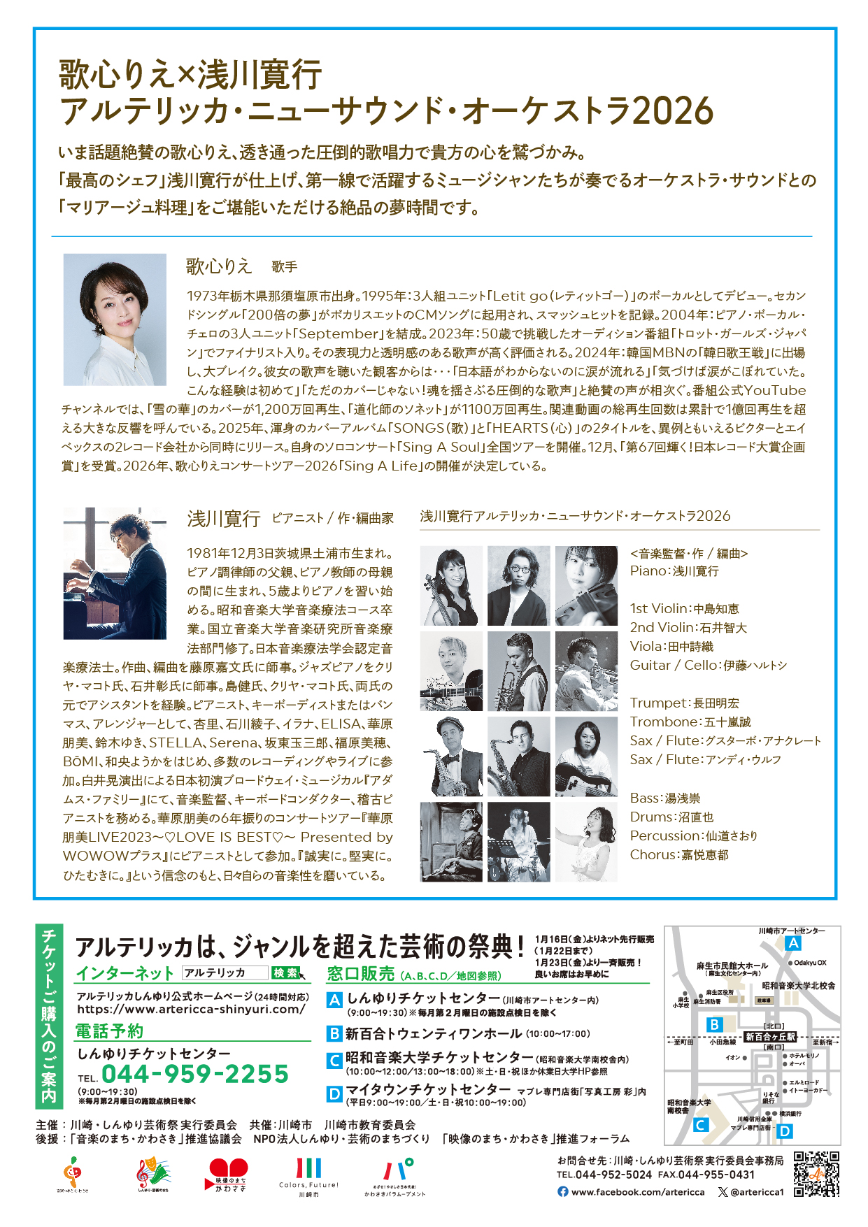 「川崎・しんゆり芸術祭」から新企画「アルテリッカ・ニューサウンド・オーケストラ 2026」が誕生します。著名アーティストと共演を重ねるピアニスト・作 / 編曲家の浅川寛行と信頼を置く第一線のミュージシャンが、YouTube総再生回数1億回超え、2025年「第67回輝く!日本レコード大賞」企画賞のポップス歌謡の女王 歌心りえを迎えます。
