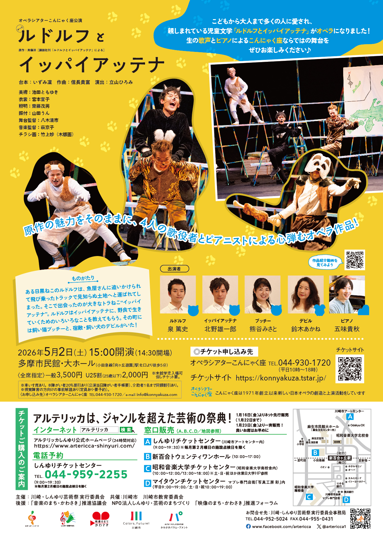 - 全席指定 一般:3,500円 U25割:2,000円 ※未就学児入場可。但しチケット要。 ※U25席=25歳以下または学生(会場にて要身分証明書提示) ※障がい者割引:主催にお問合せください。オペラシアターこんにゃく座 Tel:044-930-1720