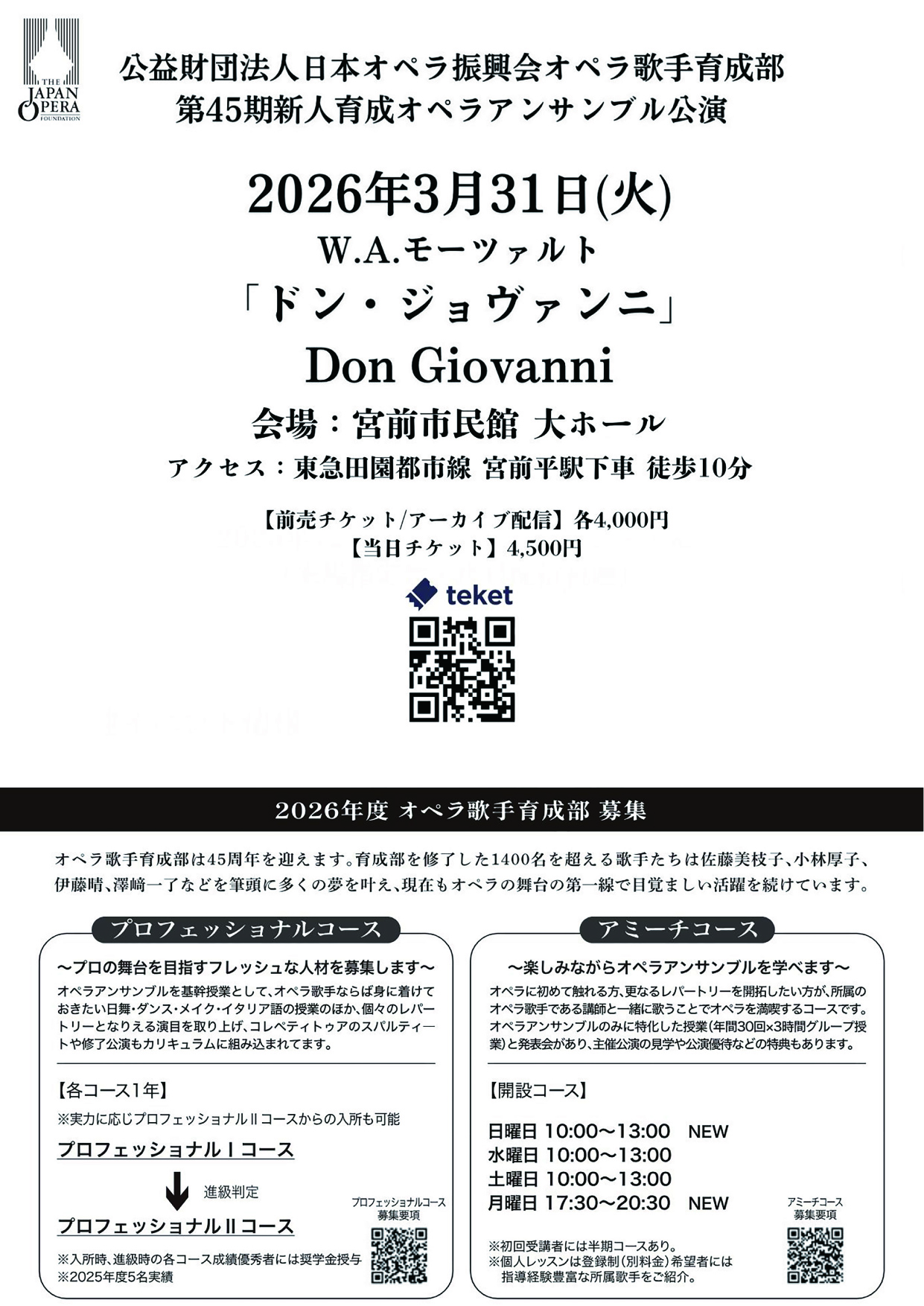 レクチャーコンサート、またはワークショップにご参加くださった方にはオペラ「ドン・ジョヴァンニ」ゲネプロ稽古(3月30日)見学会をご招待!!★3月31日(火)第45期新人育成オペラアンサンブル公演