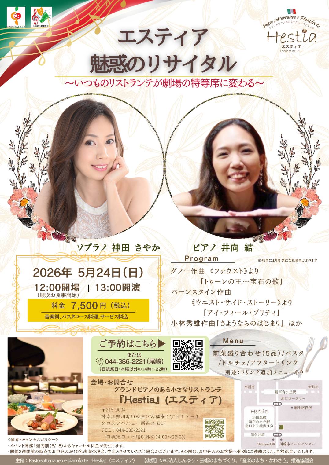 グランドピアノのある小さなリストランテ『Hestia」(エスティア)《後援》NPO法人しんゆり・芸術のまちづくり、「音楽のまち・かわさき」推進協議会