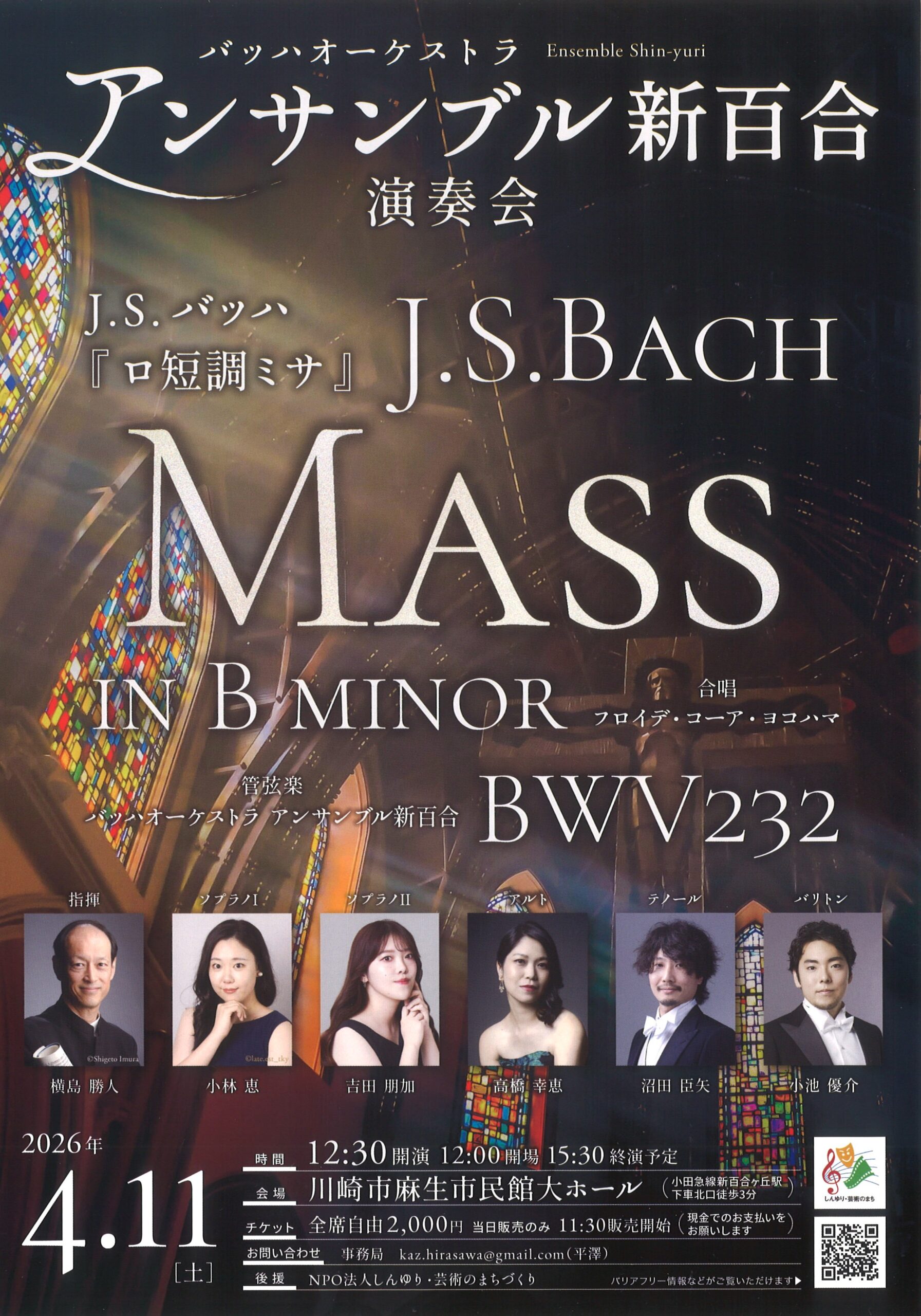 多摩区を中心に活動を展開しているバッハオーケストラ 『アンサンブル新百合』これまでもバッハのマタイ受難曲やブランデンブルク協奏曲など数々の名曲をお届けしてきましたが、ついにバッハの最高傑作『ロ短調ミサ』が麻生市民館大ホールに響き渡ります。クラシック音楽としてだけでなく文化遺産としても一度は聴いて頂きたい作品です。ご期待下さい。