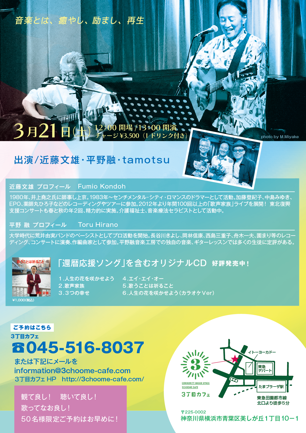 たまプラーザの「3丁目カフェ」にて、2015年から年に2,3回継続しているコンサートです。中・高齢者の方が対象になり、ご存じの曲ではお客様が自由に歌われていて、まるで歌声喫茶のようです。演奏者はギターを弾いて60年の音楽家の平野融と音楽暦50年のミュージシャンであり介護福祉士、音楽療法セラピストの近藤文雄が新しい音を目指しての心癒され、励まされ、希望にあふれた内容のコンサートです。一度体験してほしい内容です。どうぞいらしてください。